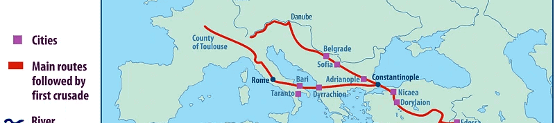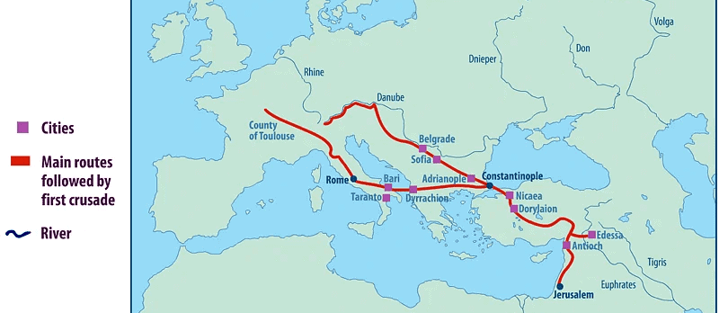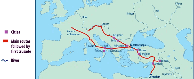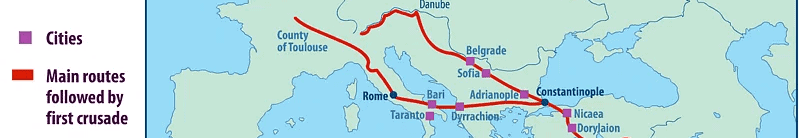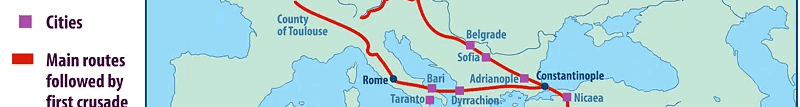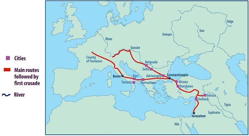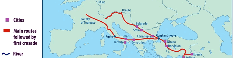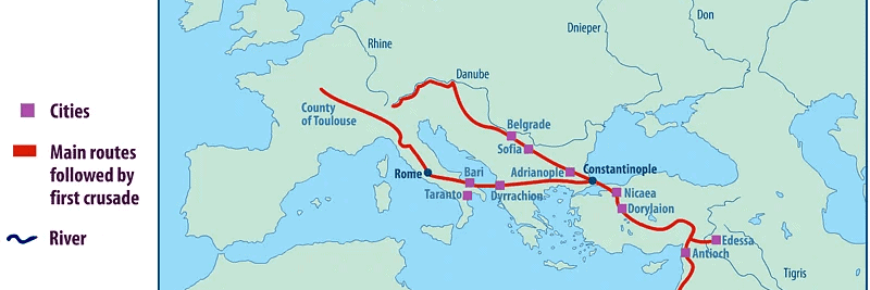 Para entenderlo, hay que volver un momento atrás. A finales del siglo XI, Europa occidental estaba llena de violencia, energía y fervor religioso; al mismo tiempo, el Imperio bizantino acababa de recibir golpes durísimos en Anatolia, sobre todo después de Manzikert en 1071, y el emperador Alejo I Comneno pidió ayuda a Occidente contra los turcos selyúcidas.
